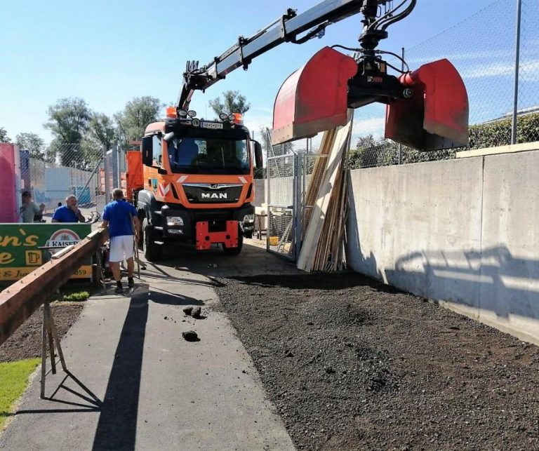 Eine Fuhre grobe Schotterschicht für den Unterbau und der Aufbau kann beginnen.