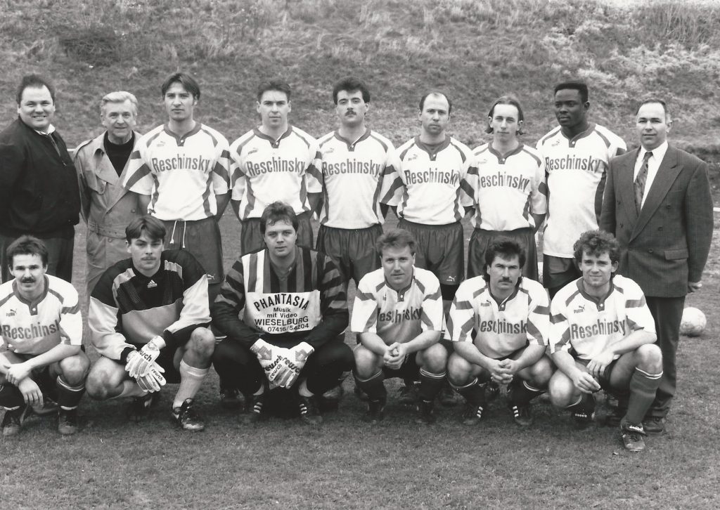 Stehend von links: Erich Mayrhofer (Bärenwirt), Obmann Franz Merkinger, Manfred Zeitlhuber, Andreas Zirkler, Manfred Hörmann, Spielertrainer Ernst Ursprunger, Thomas Sonnleitner, Eijke Ogbodigwu, Sektionsleiter Johann Sonnleitner;