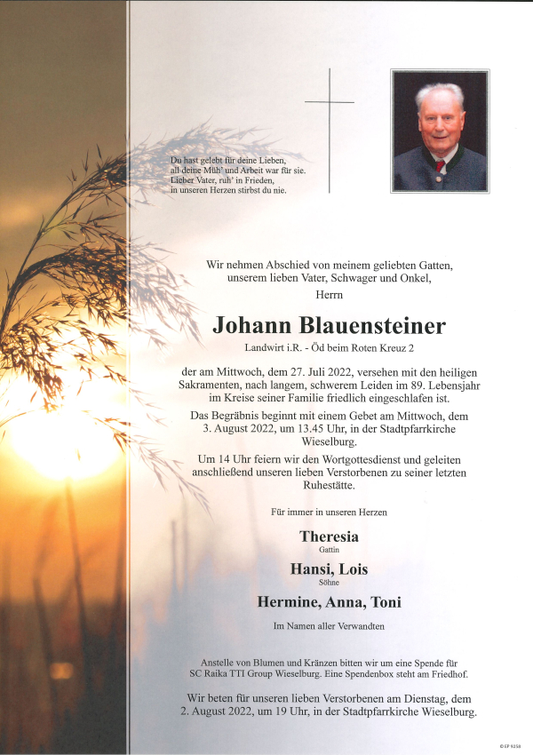 Das Begräbnis von Johann Blauensteiner beginnt am Mittwoch, 3. August 2022, um 13:45 Uhr in der Stadtpfarrkirche Wieselburg mit einem Gebet.