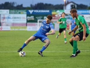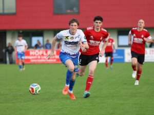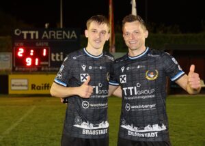 Die Torschützen: Marcel Doppler und Routinier Andi Lahmer (v.l.). 1. Landesliga 2025/26 | 22. Runde FOTOS: Rigler Meisterschaftsspiel vom Freitag, 17. April 2026 Wieselburg – Scheiblingkirchen 2:1 Tore: Doppler (27.), Lahmer (55.); Kirschner (16.); SR: Harald Lechner, TTI-Arena Wieselburg Video KM Wieselburg – Scheibling‘ (Staige TV)