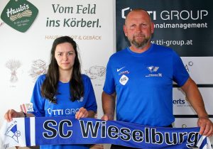 Neu beim Frauenteam: Das ist Anna Lechner. Coach Thomas Wagner (rechts) präsentiert den ersten Neuzugang für die kommende Saison. Die Wieselburger engagieren Anna Lechner. Die 24-Jährige kommt vom SV Petzenkirchen und spielte mit Nicole Wagner im LAZ. FOTO: Rigler