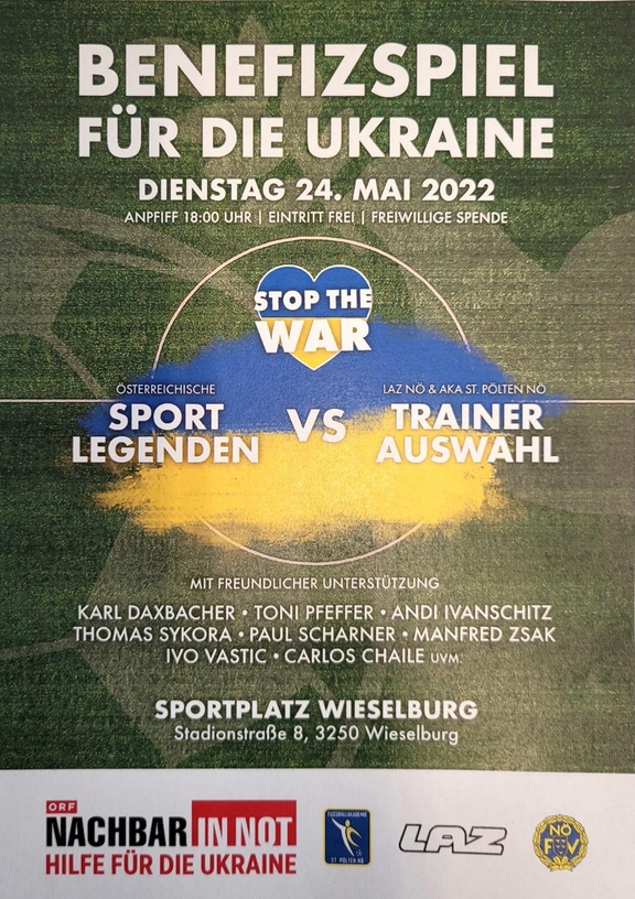 Benefizspiel für die Ukraine: In der Wieselburger TTI-Arena treten Sport-Legenden gegen eine LAZ-Trainerauswahl für Frieden und Solidarität gegeneinander an.